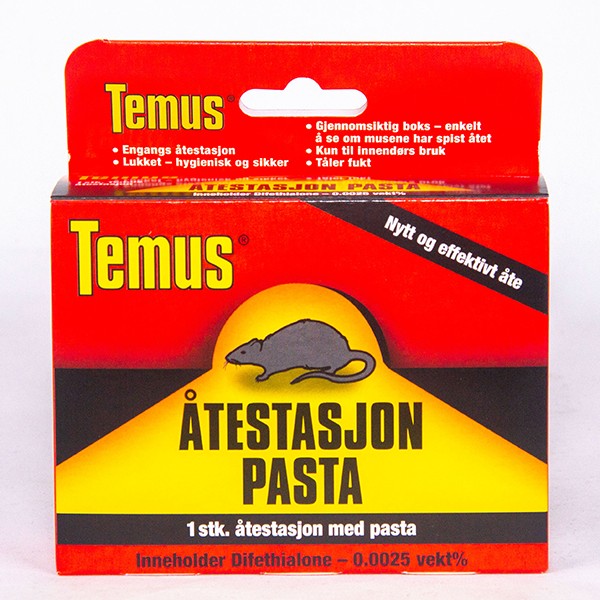 Temus Åtestasjon Pasta: Ferdig fylt en-gangs åte stasjon med Temus gift-pasta. Åte stasjonen er i klar plast, slik at det er enkelt å følge med på om det har vært mus på besøk. Åtet i fellen er nytt og svært effektivt. Det er mye brukt av profesjonelle skadedyrsbekjempere.