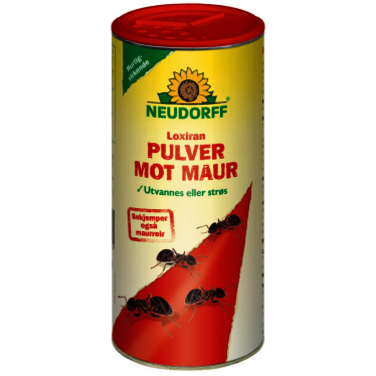 Neudorff Loxiran Pulver mot maur er et naturlig insektmidell til bekjempelse av maur. Virkningen skyldes natur-pyretrum fra krysantemumblomsten. Middelet kan brukes både som strø- og vanningmidell, og er velegnet til utendørs bruk. Ved strøing brukes 10-20 gram pr kvadratmeter på maurveier og -tuer. Ved vanning løses 20g opp i 0,5 liter vann. Vann direkte på tue, heller eller andre problemområder.