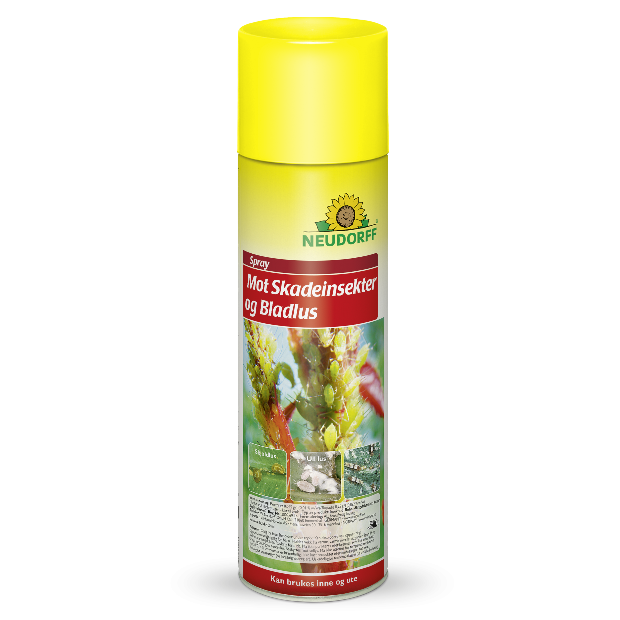 Neudorff Spray mot skadeinsekter og bladlus: Spray Mot Skadeinsekter+ og Bladlus er en hurtigvirkende spray som tar knekken på lusa og andre vanlige skadedyr som trives i prydplanter og frukttrær. Produktet er ferdig til bruk og bekjemper både larver, egg og fullt utviklede skadeinsekter.
