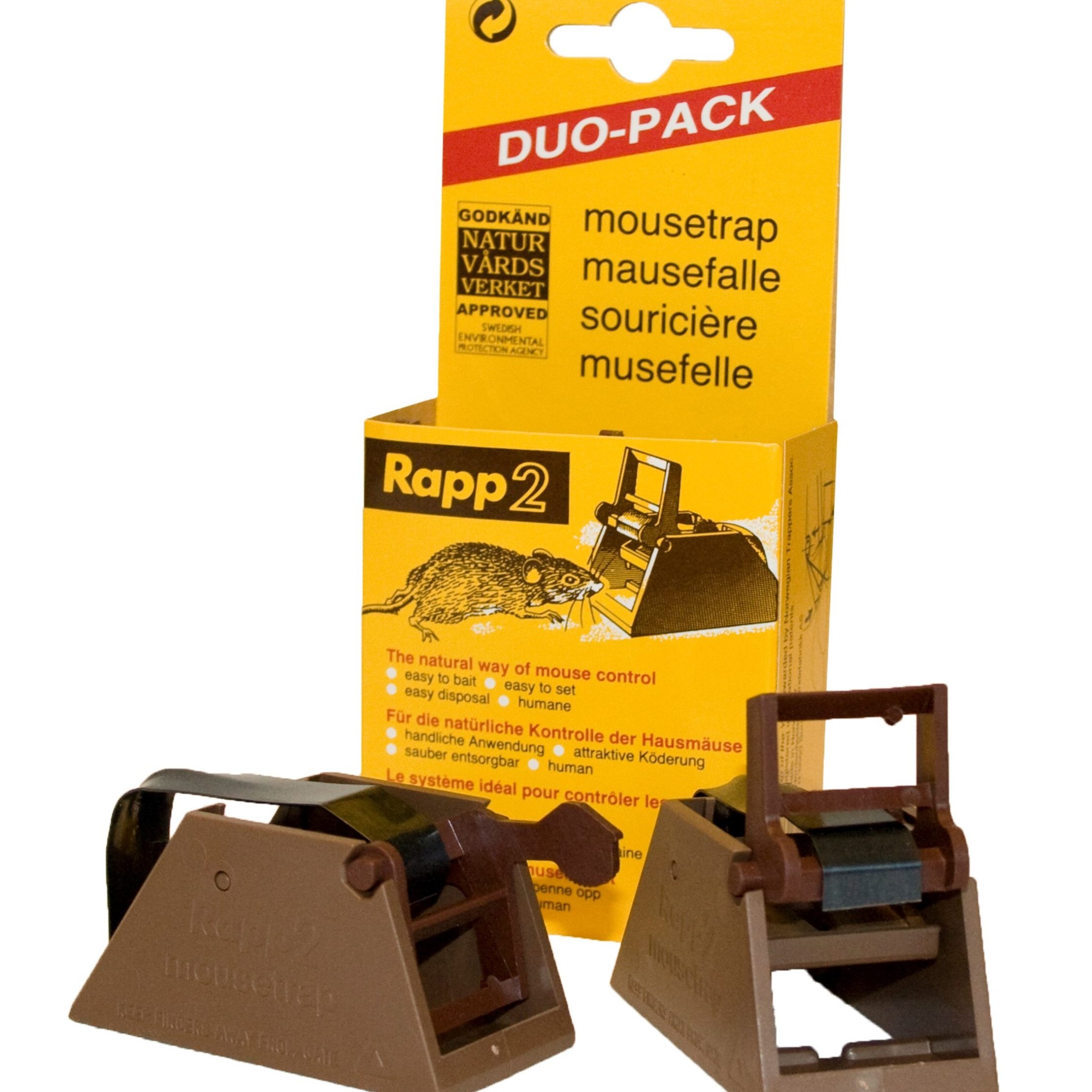 Rapp2 Musefelle er en patentert norsk musefelle i plast. Tilsett løs åte, enkel å spenne opp, enkel å tømme. Settes opp steder som mus ferdes dvs langs vegger etc.