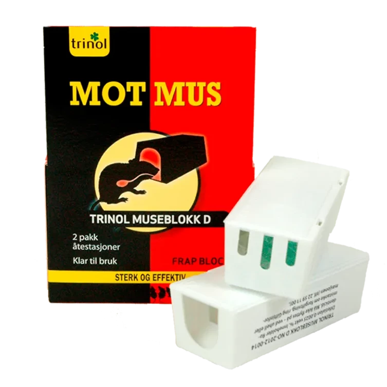 To ferdigfylte engangs åtestasjoner mot mus inne. Klare til bruk. Sterk og effektiv. Innholder giften difetialon som er en andregenerasjons antikoagulant.